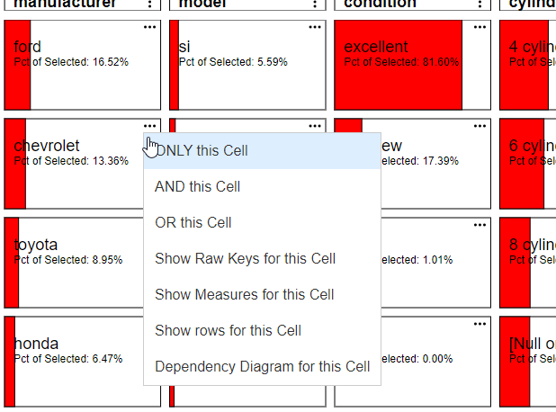 For example in the above data for the column "manufacturer" and the cell "ford"