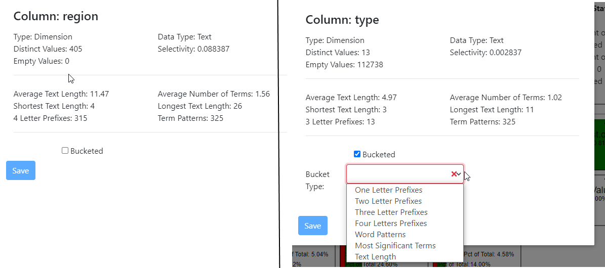 • Distinct Term Stats - statistics on the distinct terms used per cell across all rows