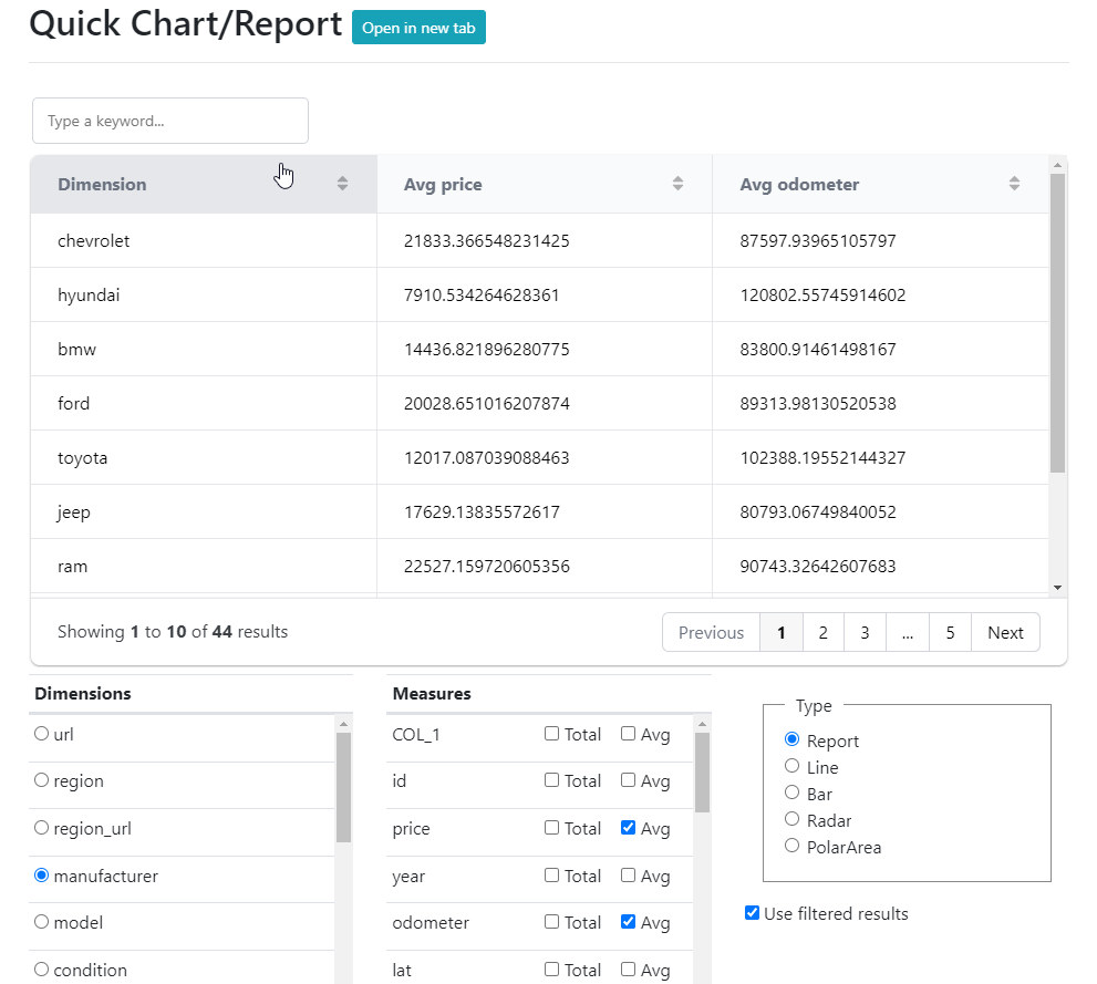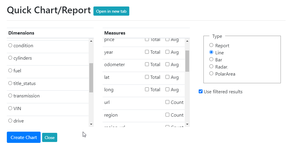 9. Quick Chart/Report - create a chart or report based on discovered dimensions and measures